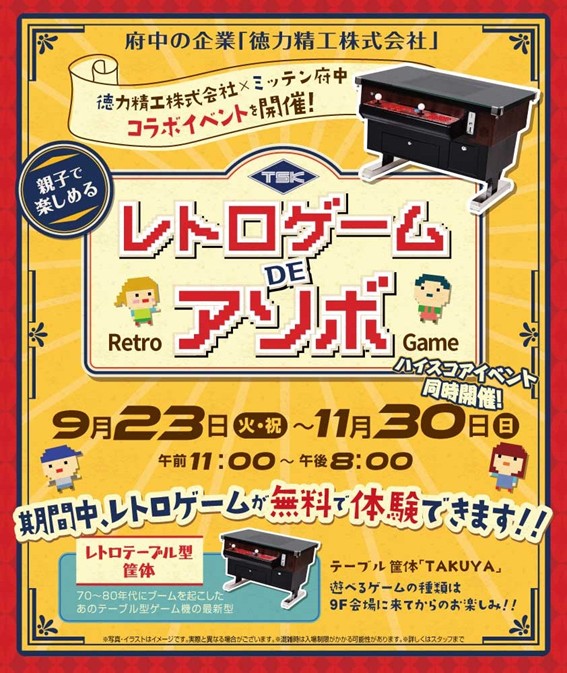 府中市のショッピングセンター「ミッテン府中」9階フードコート内にて、コラボイベント「親子で楽しめる レトロゲームDEアソボ」を開催します。